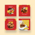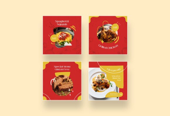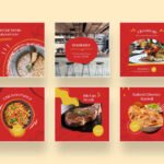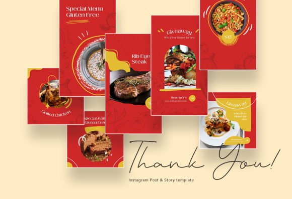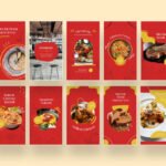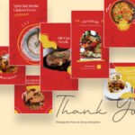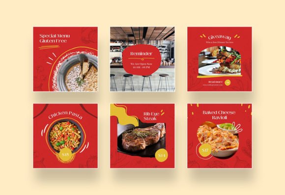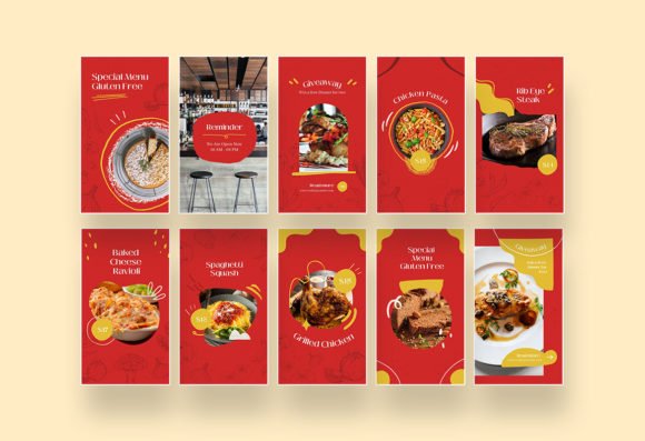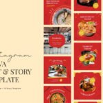These templates feature a clean, modern layout with a bold red color that stimulates appetite, complemented by yellow and white accents for a fresh and tempting look. The balanced design helps your food posts and stories stand out while keeping your branding professional.